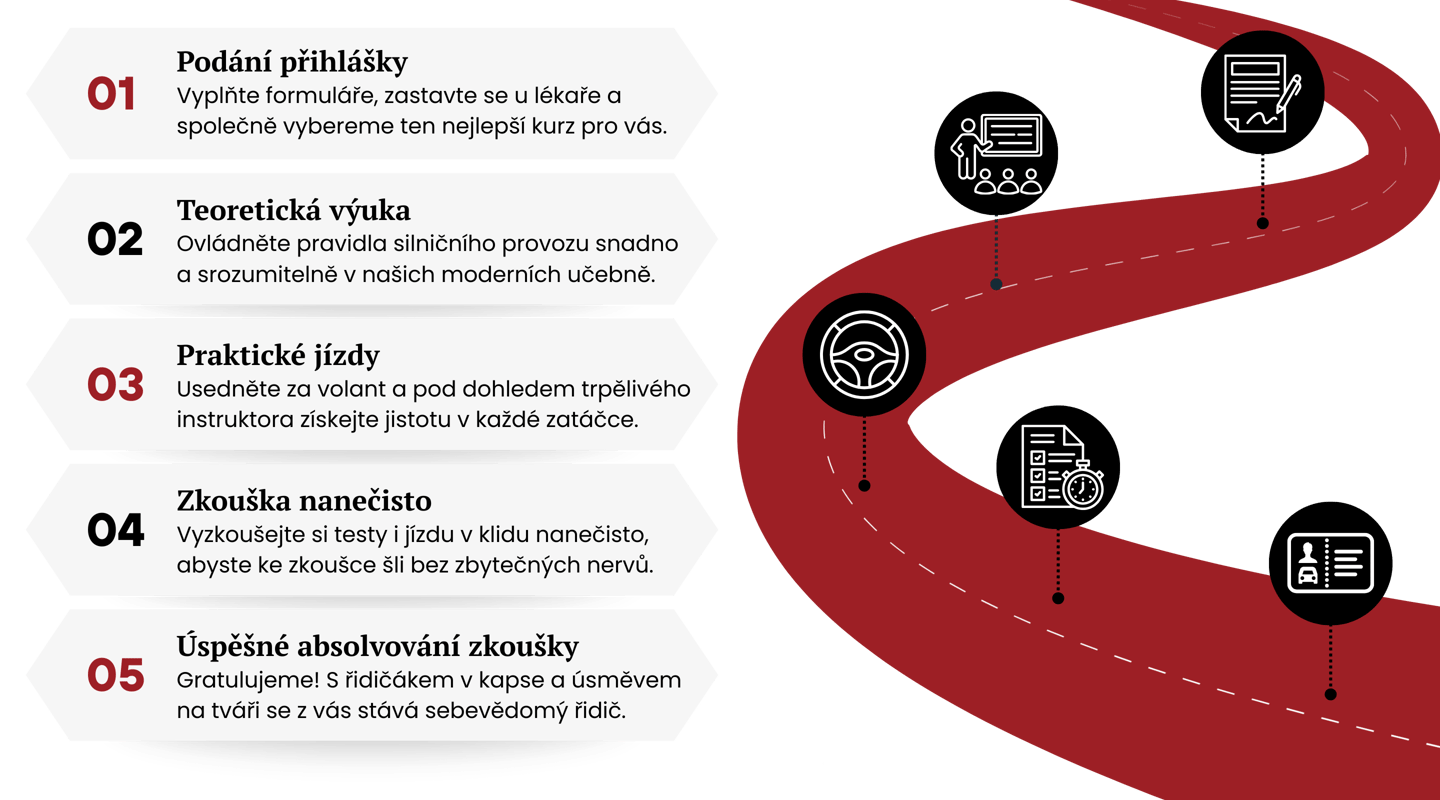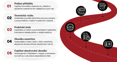 Čeká vás teoretická příprava (předpisy, zdravověda, základy údržby) a zákonem dané minimum 28 vyučovacích hodin (45 minut) praktických jízd za volantem.